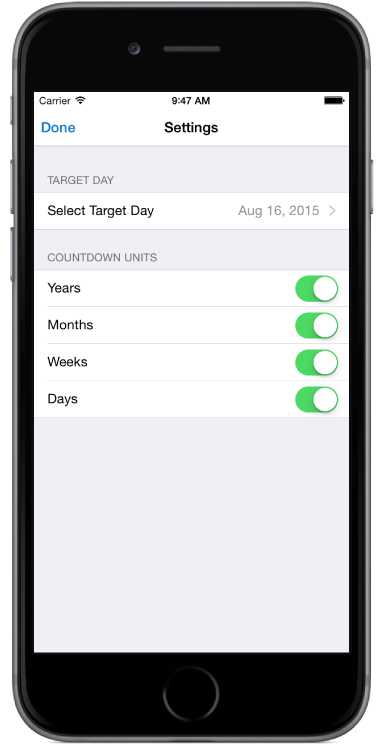 Perhaps you want to see the number of weeks or months instead of just days. Unlike other countdown apps you can freely select the time units displayed according to your preference - years, months, weeks and/or days. When the countdown is completed you will get a clean and simple notification.
