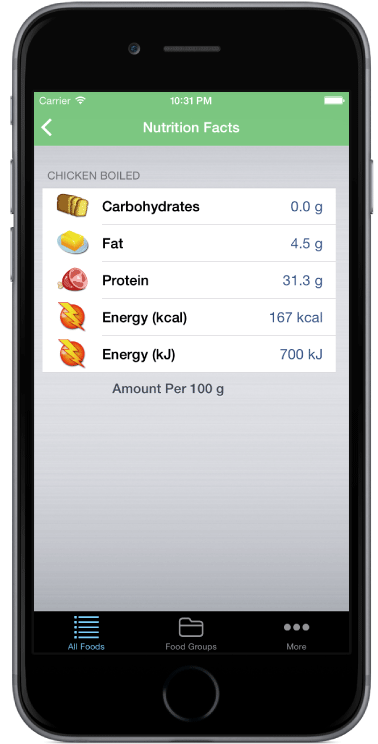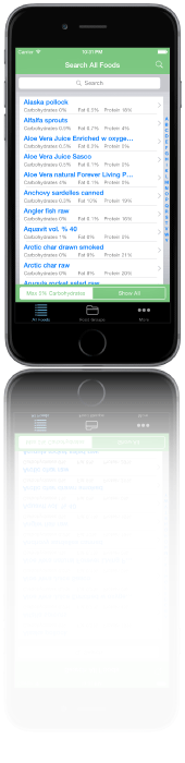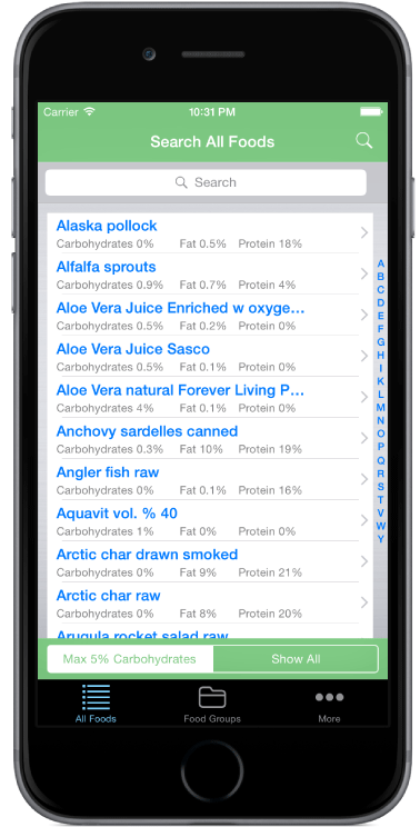 The Max 5% Carbs App makes it easy to find food and drinks with low carbohydrate content. You can search among over 2000 nutrients in a complete nutrition database and easily filter out results with more than five percent carbohydrates. Nutrition facts such as carbohydrates, fat, protein and energy (calories) are available for all nutrients.