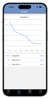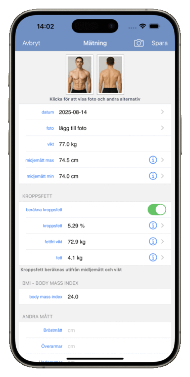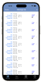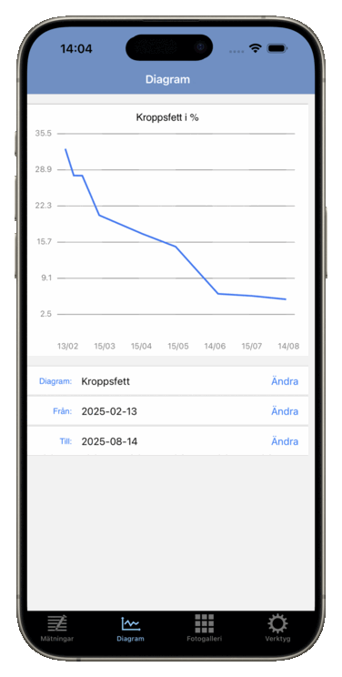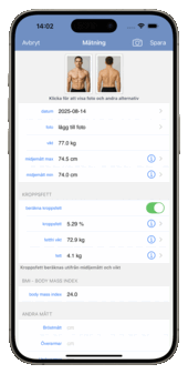 Oavsett om ditt mål är att gå ner i vikt, bygga muskler eller följa din träningsutveckling gör Formkollen det enkelt att registrera mätningar för vikt, midja, armar, bröst, axlar, hals, höft, lår eller vader. Andelen kroppsfett räknas automatiskt ut från vikt och midjemått - eller anges manuellt. Se alla resultat i en tydlig lista och lättlästa diagram.